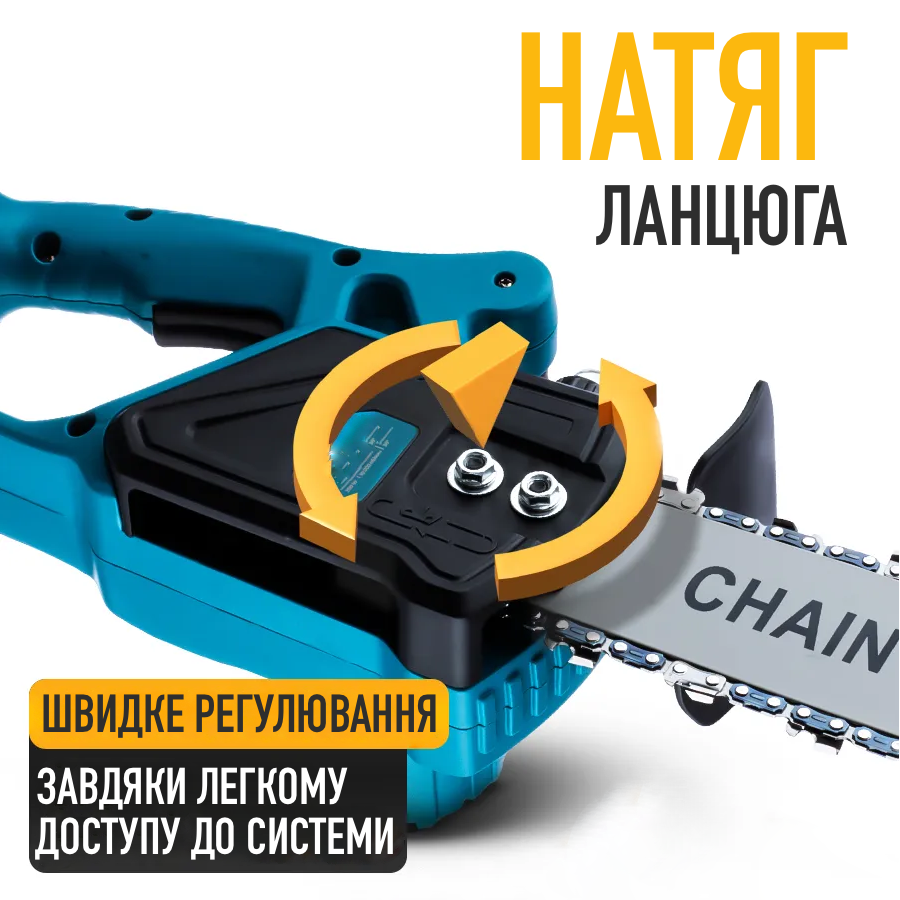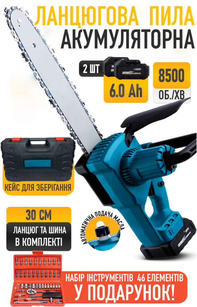 Ланцюгова пила з 2 акумуляторами 6.0 Ah працює зі швидкістю 8500 об/хв, що забезпечує високу продуктивність. У комплекті йдуть ланцюг та шина 30 см для точного й швидкого розпилу. Автоматична подача оливи зменшує знос і підтримує ефективність роботи. Набір інструментів на 46 елементів – у подарунок.
