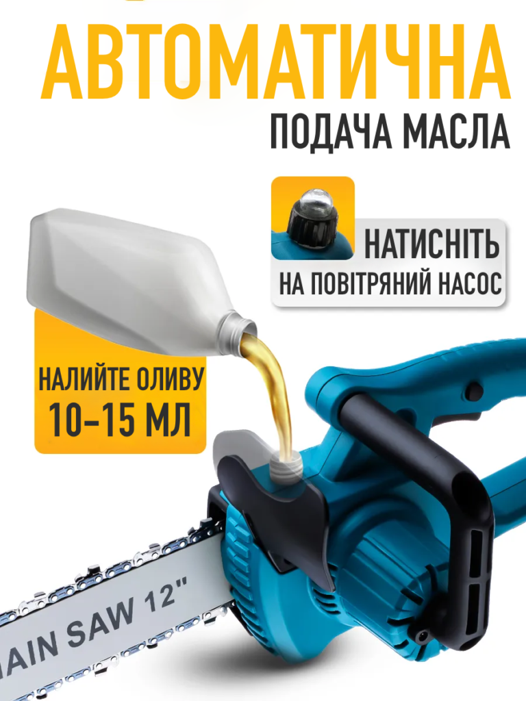 Просте обслуговування завдяки системі автоматичної подачі оливи. Достатньо налити 10-15 мл оливи та натиснути на насос, щоб забезпечити змащення ланцюга.
