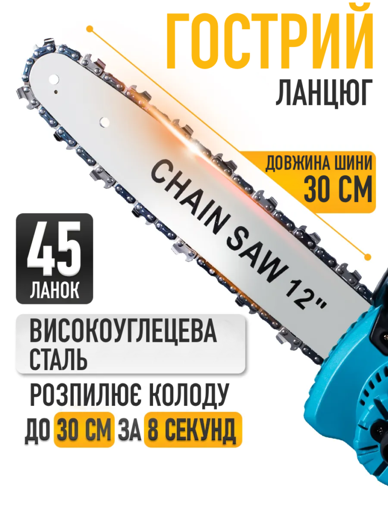 Шина 30 см та 45 ланок ланцюга з високовуглецевої сталі дозволяють розпилювати колоди діаметром до 30 см всього за 8 секунд.