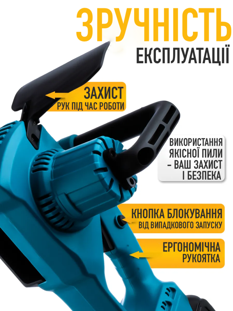 Для безпечної та зручної роботи пила оснащена захистом рук, кнопкою блокування від випадкового запуску та ергономічною рукояткою для точного контролю.